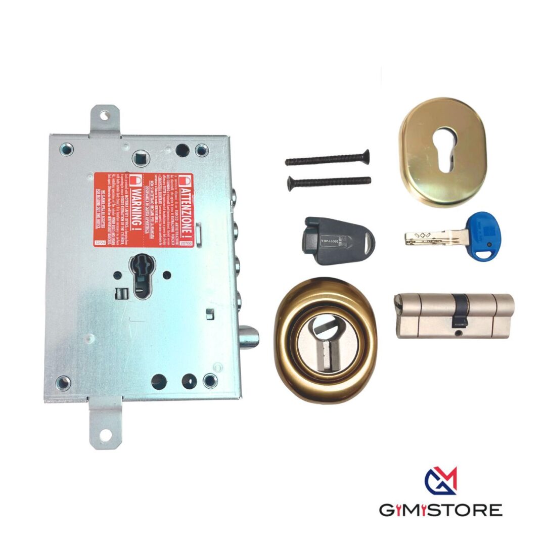 • Kit composto da Serratura mod Mottura cilindro europeo Mottura  serie 82 nucleo ad ingranaggi. Doppio dispositivo  di blocco in caso di forzatura –reversibile- ent.73 mm -interasse mm 28
