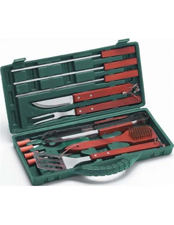 Il set comprende: forchettone, paletta, pinza, 3 spiedini lunghi, coltello con manico lungo, spazzola per grill, 4 mini forchette per pannocchia.