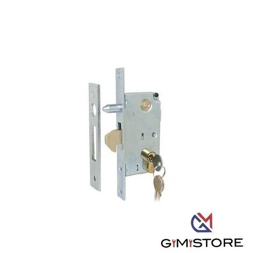 Serratura a gancio con perno per cancelli scorrevoli, in acciaio zincato, completa di cilindro 54 mm con 3 chiavi e contropiastra.