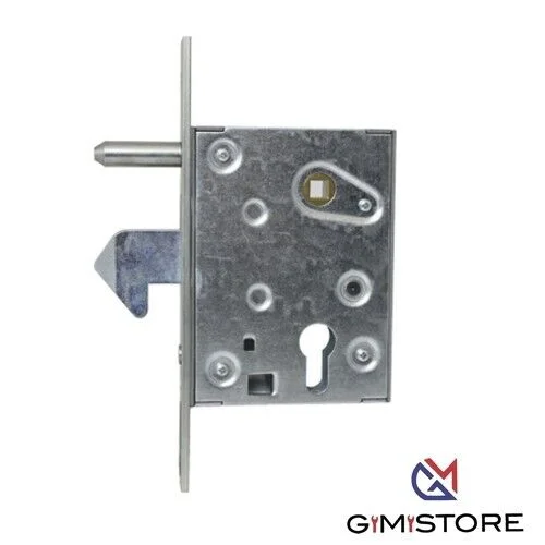 Con cilindro sagomato. Chiusura a 1 mandata e mezzo giro. Catenaccio a gancio con punta smussata e perno fisso. Quadro maniglia Mm. 8. Frontale in acciaio zincato con bordo quadro da Mm. 25×211. Altezza scatola Mm. 130. In dotazione: 2 chiavi piatte.