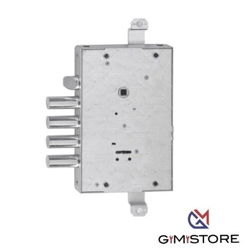 Chiusura triplice con catenaccio a 4 pistoni e 4 mandate, sporgenza Mm. 3,5 e corsa Mm. 40, e predisposizione per fissaggio aste, corsa Mm. 20.