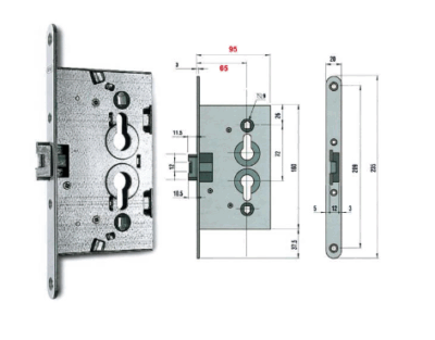 Per doppio cilindro sagomato. Scrocco reversibile con catenaccio incorporato. Chiusura a 1 mandata. Quadro maniglia Mm. 9. Frontale in acciaio zincato con bordo tondo da Mm. 20×235. Altezza scatola Mm. 160.